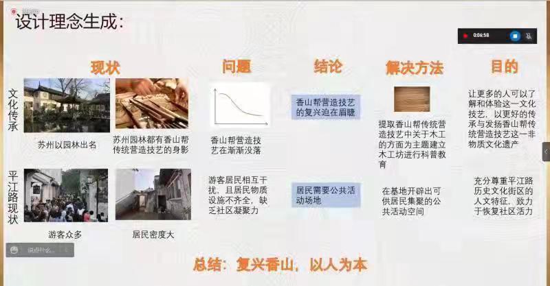 答辩过程中,四校员工聚焦传统建筑保护、功能业态创新、木结构加固、公共环境设计、室内空间设计等视角进行方案汇报,各位老师针对答辩内容进行提问,师生互动交流氛围浓厚,同学们收获颇丰。答辩结束后,各组老师对本次联合设计进行总结,并对同学们后续的设计发展提出了宝贵建议。