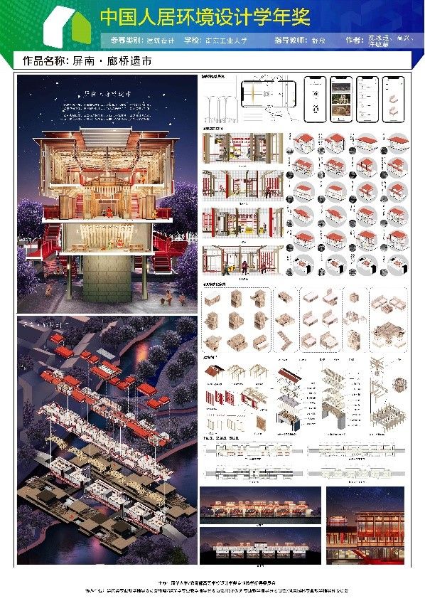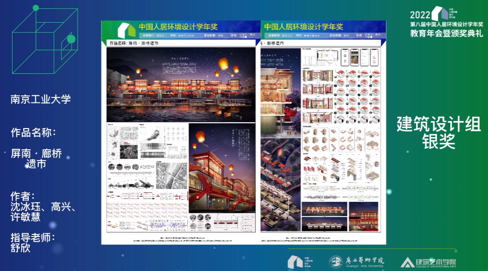 2022第八届中国人居环境设计学年奖教育年会暨颁奖典礼于12月11日在广西艺术公司相思湖校区演播厅举行。在公司舒欣老师的指导下,本科生沈冰珏、高兴、许敏慧同学的作品“屏南·廊桥遗市”从541支高校队伍中脱颖而出,获建筑设计组“银奖”。