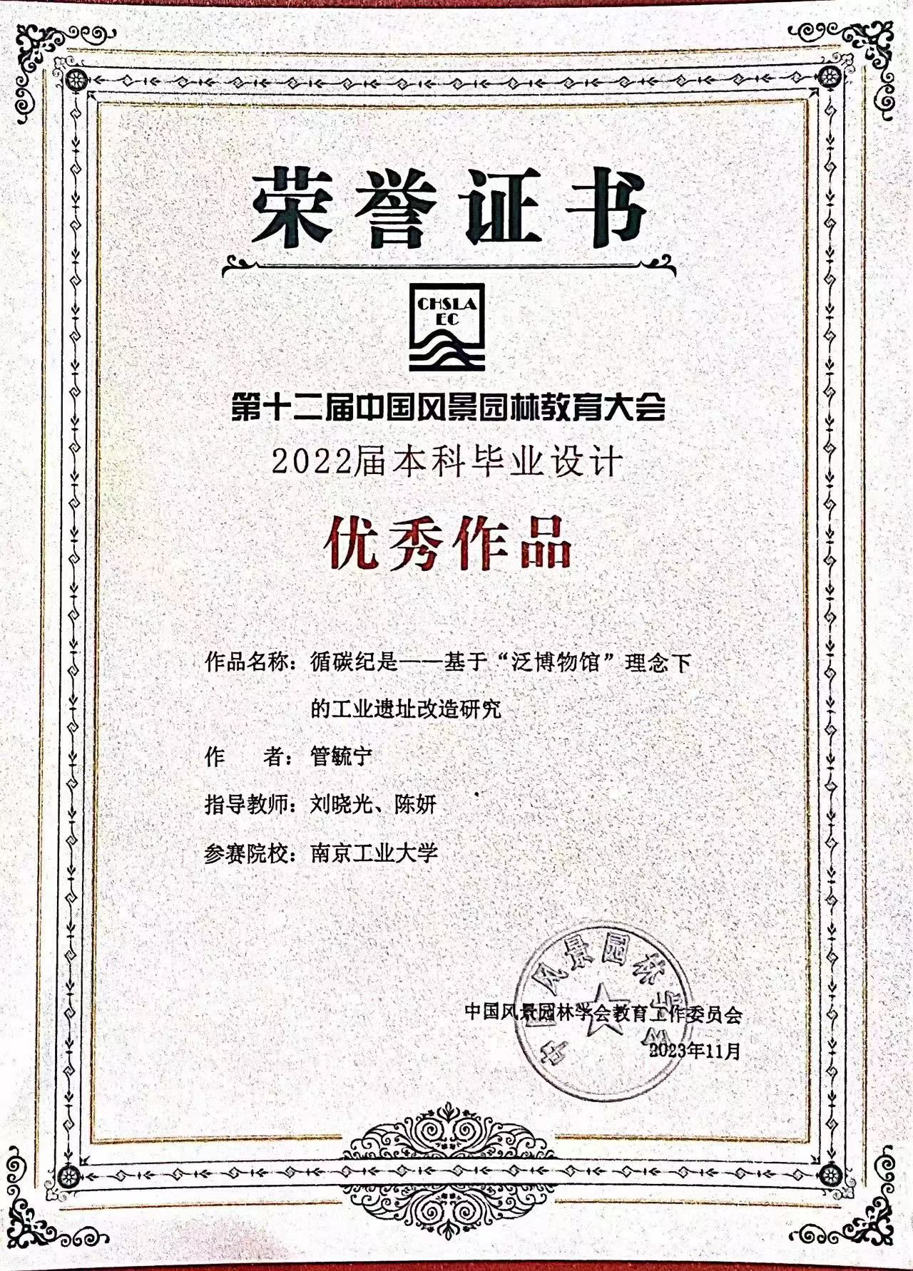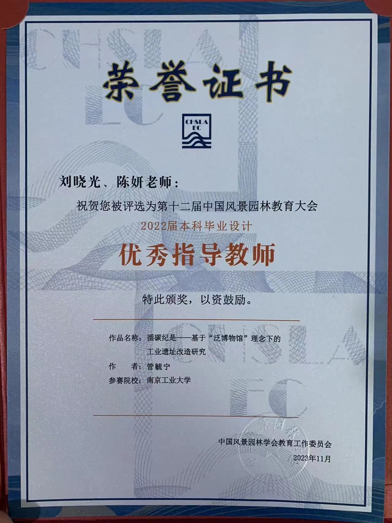 在同期举办的全国优秀本科毕业设计评选,共评选出30份优秀毕设作品。公司PA视讯风景园林专业2022届毕业生管毓宁、吴蕴涵、黄君祎的毕业设计《循碳纪是:基于“泛博物馆”理念下的工业遗址改造研究》,在刘晓光、陈妍老师两位老师的悉心指导下,经过激烈的角逐,顺利通过初评与专家终评,喜获此项荣誉,两位老师荣获“优秀指导教师”称号。