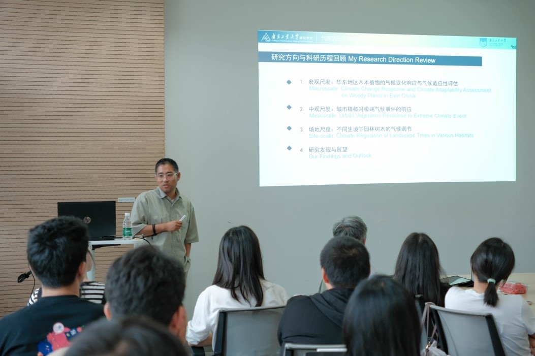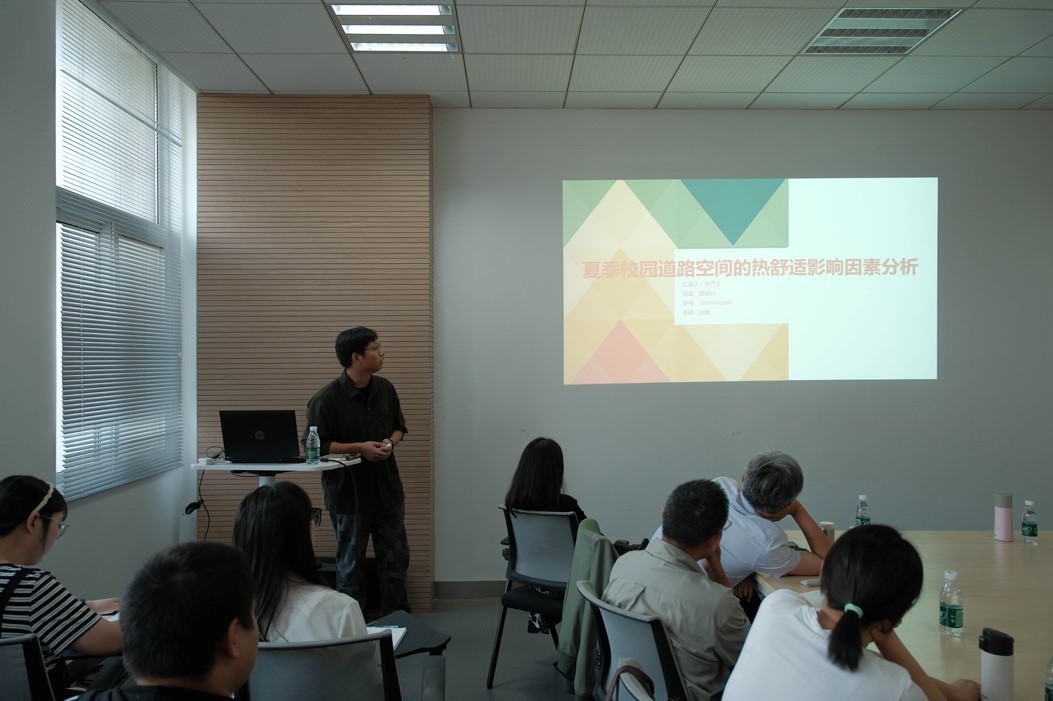 刘鸣老师系统讲解了博士至今在园林植物气候适应性方面的多尺度研究成果,并和两位研究生同学一起介绍了今年夏天开展的有关城市植被对高温和台风两种极端天气响应的调查工作。