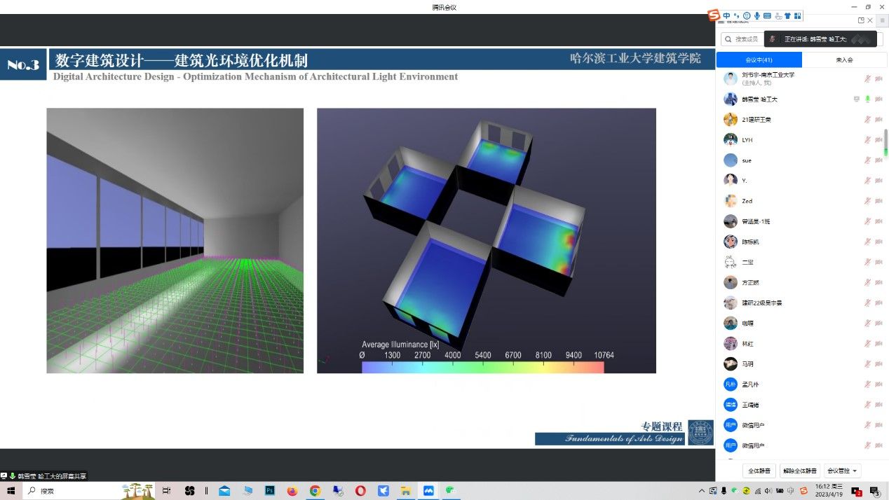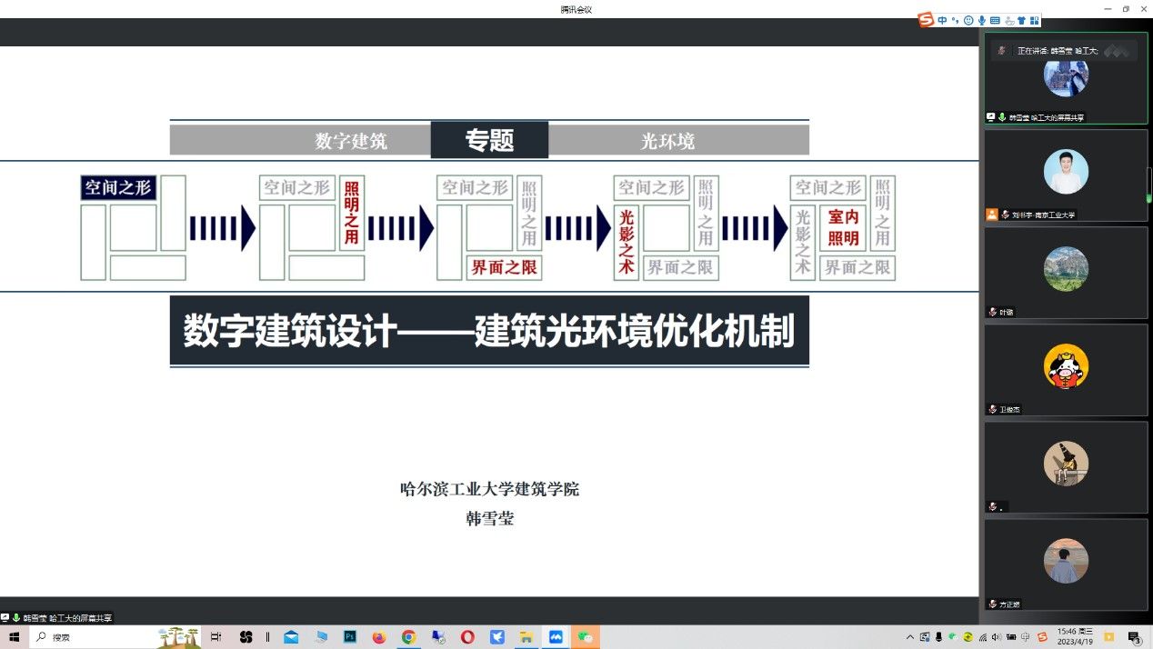 4月19日下午,PA视讯主办的2023年度数字建筑研究生课程系列讲座第三讲在腾讯会议平台顺利举办。报告嘉宾为哈尔滨工业大学PA视讯的韩雪莹老师,报告主题为“数字建筑设计——建筑光环境优化机制”。讲座由刘书宇副研究员主持,PA视讯四十余名师生聆听了讲座。