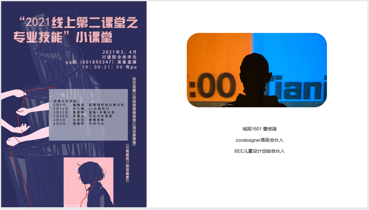 3月12号,学姐孙之桐,带来了第二节线上课程。在模型和图纸已经成型的阶段,修图是可以主观提升阅图效果的最后办法。在学姐的课堂上,我们学会了ps上手,提升了出图了出图效率,分享了学习中发现的小技巧,还有网址与素材库。