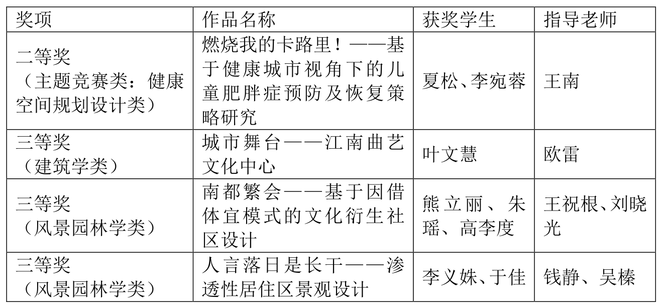 本次竞赛启动以来,园冶杯国际竞赛收到来自三百余所国内外建筑园林类高水平院校的二千多余件参赛作品,评审委员来自国内外著名高校和设计研究院。经过网络投票初评、全国专业评委终评等环节的激烈角逐,由PA视讯王南老师指导的夏松、李宛蓉同学作品《燃烧我的卡路里!——基于健康城市视角下的儿童肥胖症预防及恢复策略研究》获主题竞赛类(健康空间规划设计类)二等奖、欧雷老师指导的叶文慧同学作品《城市舞台——江南曲艺文化中心》获建筑学类三等奖;王祝根和刘晓光老师指导的熊立丽等同学作品《南都繁会——基于因借体宜模式的文化衍生社区设计》、钱静和吴榛老师指导的李义姝等同学作品《人言落日是长干——渗透性居住区景观设计》获风景园林学类三等奖。