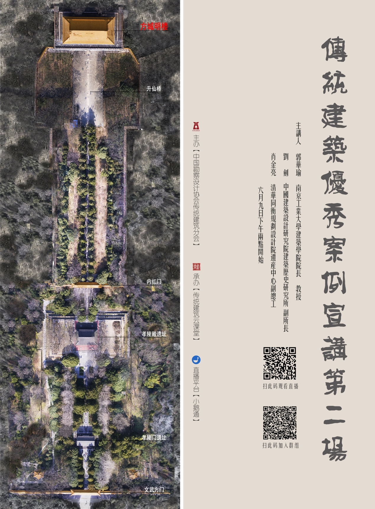 郭华瑜教授作为本次活动的主持人,做了题为《世界文化遗产:“南京明孝陵明楼” 、“四方城”加项保护设计实践与思考》的学术报告。她以南京明孝陵、四方城、方城明楼为载体,对文物建筑保护原则与方法在遗产实践中的运用展开反思与探讨,受到众多在线与会学者的好评与热烈反响。此外,中国建筑设计研究院有限公司建筑历史研究所刘剑副所长、清华同衡规划设计院遗产中心肖金亮副总工分别分享了题为《基于系统性表达的文化遗产展示与阐释方法初探:以老司城遗址保护与展示工程设计为例》、《多样化建筑基因的保护:以北京、甘肃和河南若干古建筑修缮实践为例》的精彩报告。