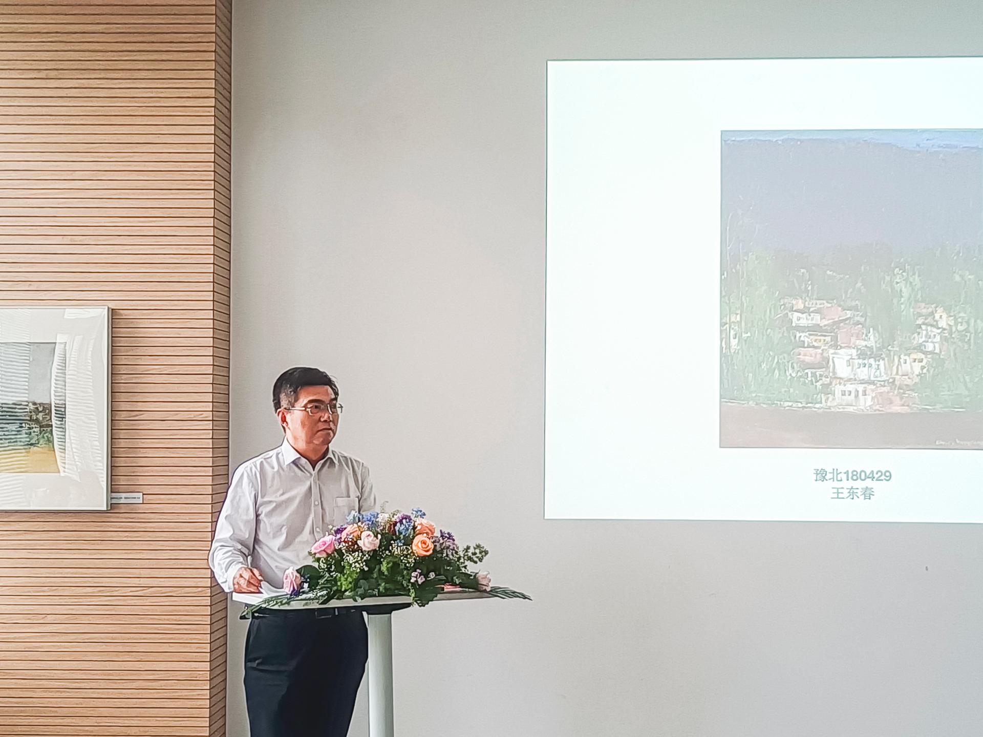 郭华瑜经理致开幕词,介绍了王东春老师的简历以及艺术上的成就。郭经理表示,PA视讯一直将建筑美育作为教学的重要环节,引导员工认识美、理解美、欣赏美、创造美。随后王东春老师介绍了本次画展的内容。
