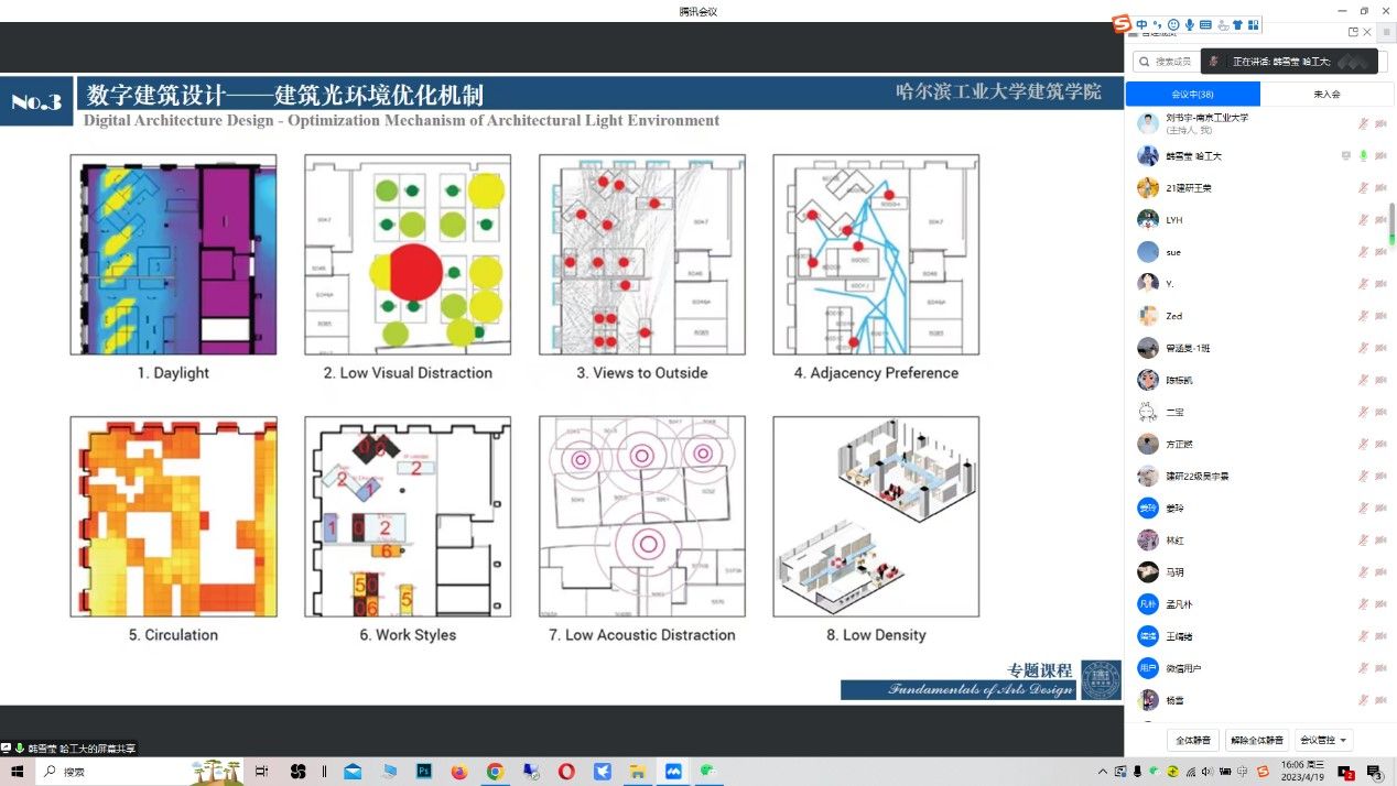 4月19日下午,PA视讯主办的2023年度数字建筑研究生课程系列讲座第三讲在腾讯会议平台顺利举办。报告嘉宾为哈尔滨工业大学PA视讯的韩雪莹老师,报告主题为“数字建筑设计——建筑光环境优化机制”。讲座由刘书宇副研究员主持,PA视讯四十余名师生聆听了讲座。
