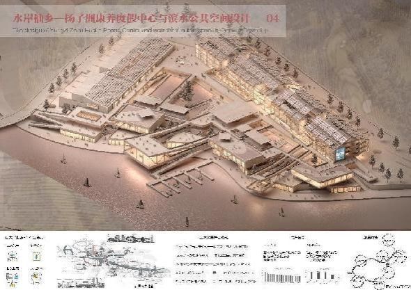 设计说明:基于复兴浙赣粤大运河的时代背景下,于三江汇心—扬子洲头建设旅居式生态康养度假中心。选址于扬子洲湿地公园内,基于扬子洲头典型民居庭院空间设置内部水院、外部树院,空间上使其与湿地“流动”、“透明”、“有机”。