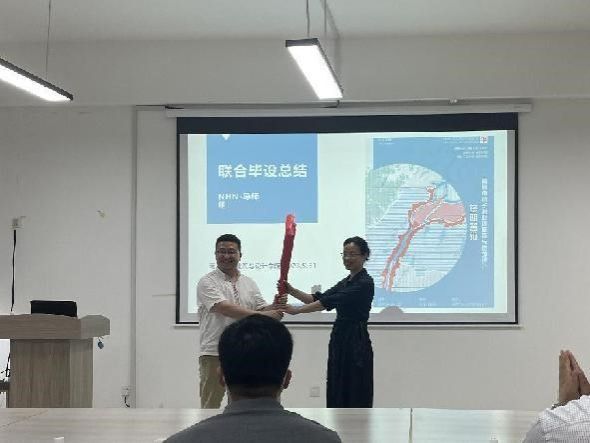 闭幕式由华侨大学PA视讯连旭老师主持。首先,南昌大学建筑与设计公司周韬老师宣布了优秀奖获奖名单。其次,三个公司的员工代表发言;他们纷纷表示,经历了4个多月的学习受益匪浅,题目具有新颖性和开放性,学术讲座与案例分享会具有前瞻性和实践性,三校协同方式发挥了他们的团队合作精神。随后,三校教师代表王雪强老师、连旭老师和邢凯老师进行了总结发言,并接受了本次毕设主办单位南昌大学建筑与设计公司的赠书。最后,南昌大学建筑与设计公司建筑系主任王雪强老师和华侨大学PA视讯建筑系副主任黄鹭红老师,进行了联合毕业设计联盟旗帜交接。黄鹭红老师表示,华侨大学作为2024年联合毕业设计的主办单位,目前已经启动了毕业设计的选题工作,并期待明年在厦门继续成功举办联合毕业设计。