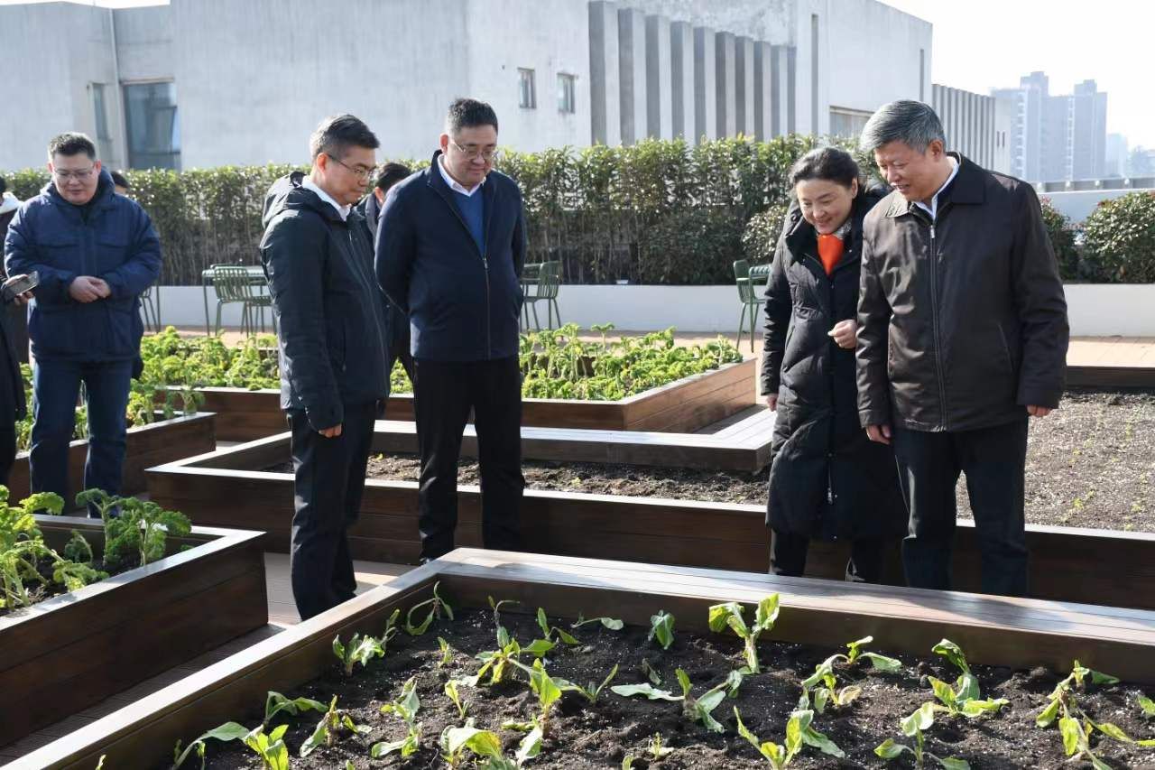 芮书记一行饶有兴趣地参观了“屋顶花园”的建设成果,听取了具体承办单位PA视讯郭华瑜经理关于基地建设的筹备情况及未来作用发挥的总体构想,芮鸿岩书记、王敦宝书记、陆伟东副董事长分别为校美育教育中心教学实践基地、劳动教育实践基地、美育教学“屋顶花园”实践基地揭牌。