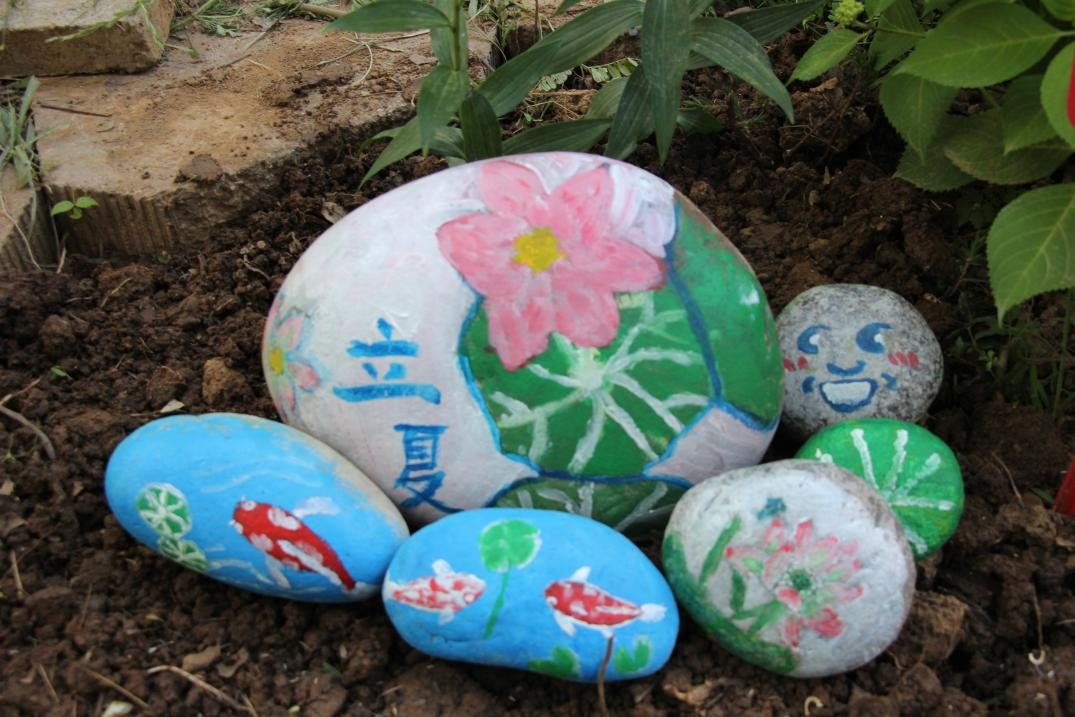 活动前期,两院员工分组结对,充分研讨,结合农耕文化,自选节气主题进行绘画设计。活动现场,小组成员们结合基地的实际地形和植物场景,进行了立春、春分、惊蛰、立夏、秋分等八个节气主题的石头手绘和园景设计。同学们在石头上活灵活现地展现了不同节气的万物生长状态,以“万物复苏,草长莺飞”来描绘春分时节,以“小麦饱满,江河渐满”来体现小满时节,以“三秋大忙,硕果累累”表达秋分时节……