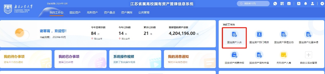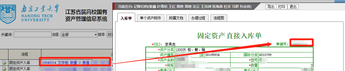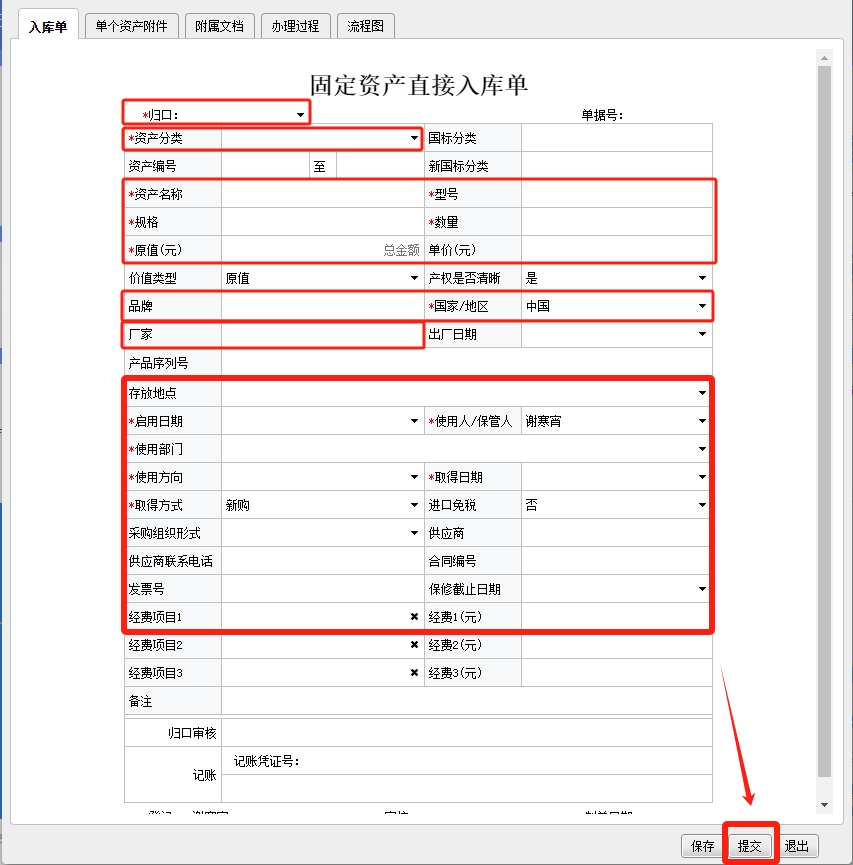 2.点击主页的【固定资产入库】填写“固定资产直接入库单”然后【提交】。